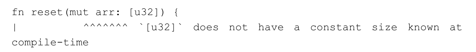 意思是,编译器无法确定参数[u32]类型的大小。有两种方式可以修复此错误,第一种方式是使用[u32;5]类型,如代码清单3-3所示。
