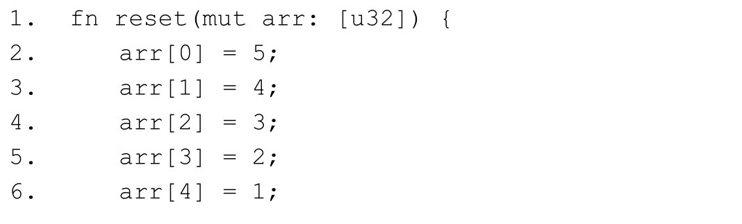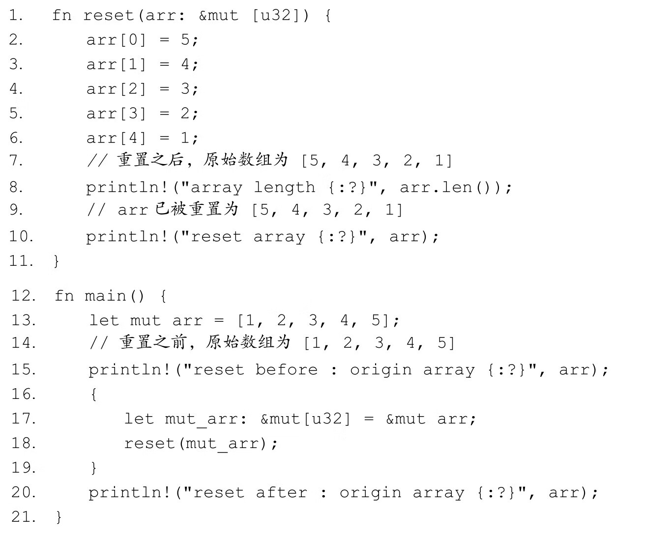 代码清单3-4中使用了&mut [u32],它是可变借用,&[u32]是不可变借用。因为这里要修改数组元素,所以使用可变借用。从输出的结果可以看出,胖指针&mut [u32]包含了长度信息。将引用当作函数参数,意味着被修改的是原数组,而不是最新的数组,所以原数组在reset之后也发生了改变。