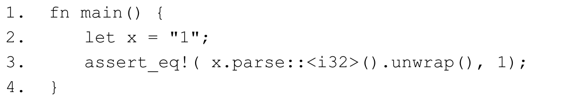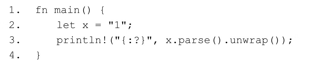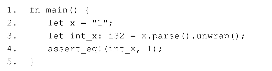 代码清单3-12是想把字符串"1"转换为整数类型1,但是parse方法其实是一个泛型方法,当前无法自动推导类型,所以Rust编译器无法确定到底要转换成哪种类型的整数,是u32还是i32呢?毕竟Rust中整数类型很丰富。所以这里就需要直接给出明确的类型标注信息了,如代码清单3-13所示。