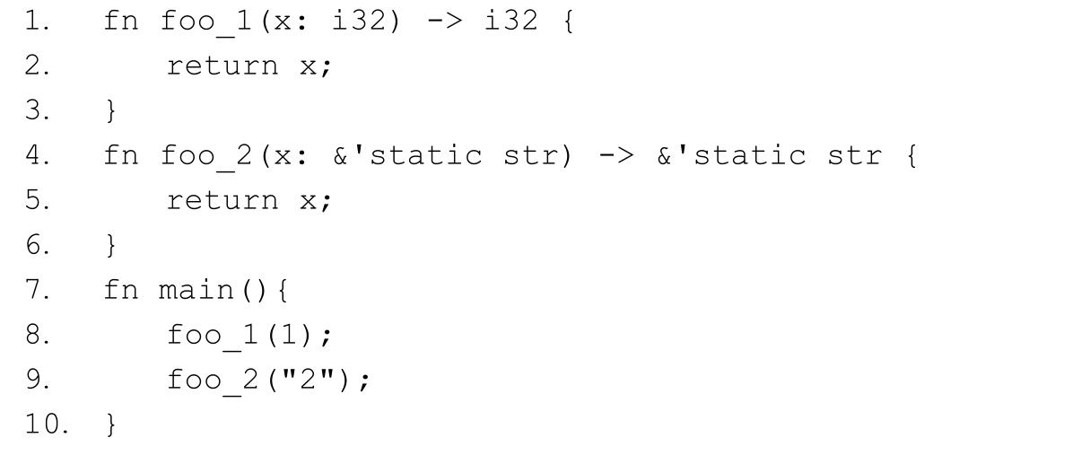 Rust中的泛型属于静多态,它是一种编译期多态。在编译期,不管是泛型枚举,还是泛型函数和泛型结构体,都会被单态化(Monomorphization)。单态化是编译器进行静态分发的一种策略。以代码清单3-16中的泛型函数为例,单态化意味着编译器要将一个泛型函数生成两个具体类型对应的函数,代码清单3-16等价于代码清单3-20。