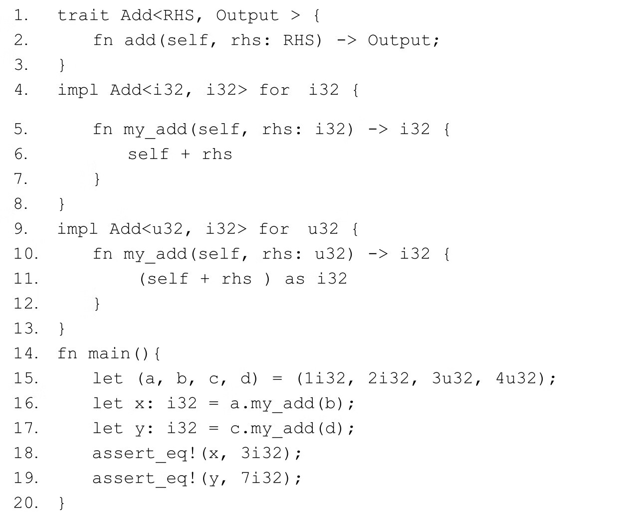 代码清单3-22中定义了Add trait。它包含了两个类型参数:RHS和Output,分别代表加法操作符右侧的类型和返回值的类型。在该trait内定义的add方法签名中,以self为参数,代表实现该trait的类型。