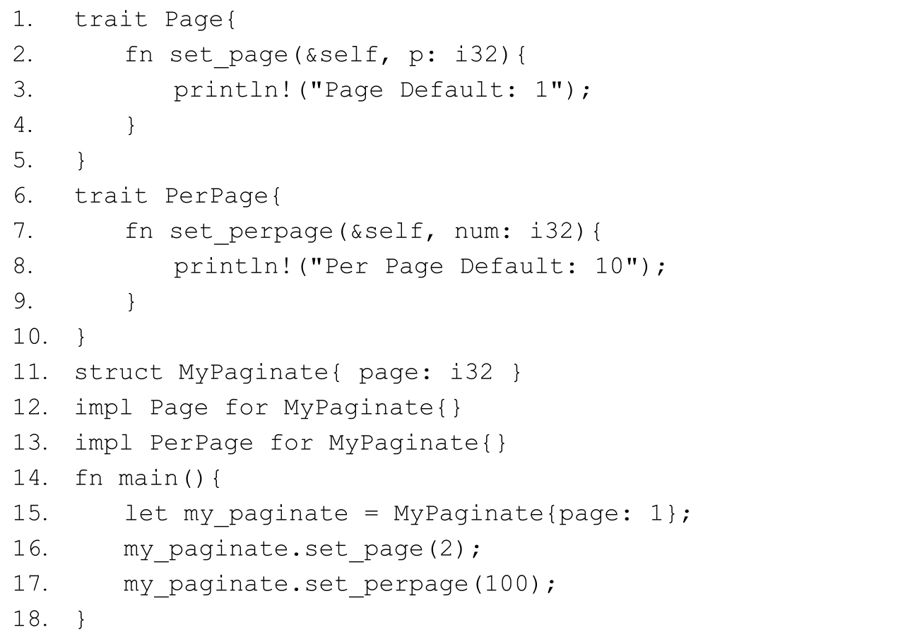 代码第12行和第13行分别为MyPaginate实现了Page和PerPage,使用空的impl块代表使用trait的默认实现。