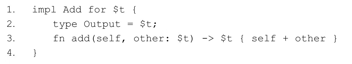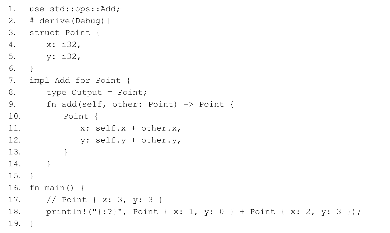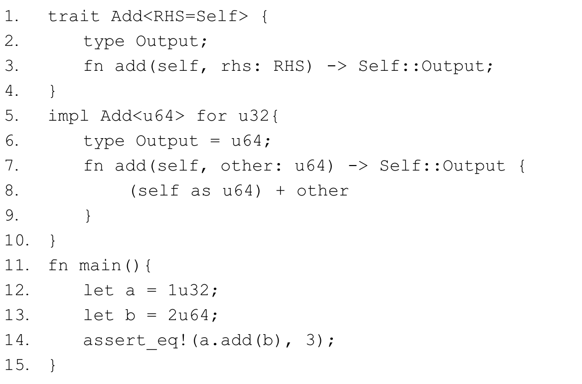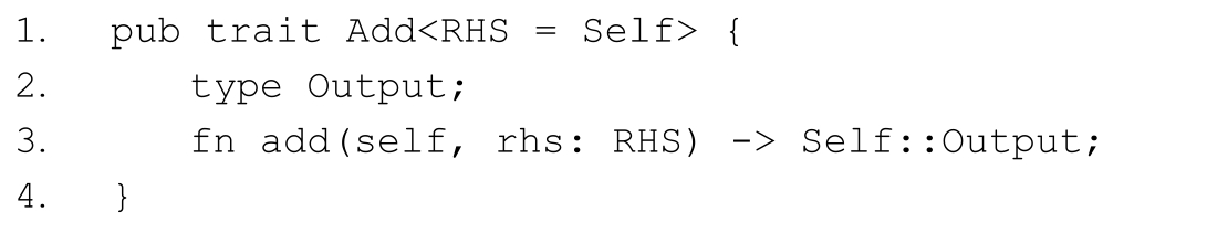 代码清单3-23展示了Rust标准库中Add trait的定义。