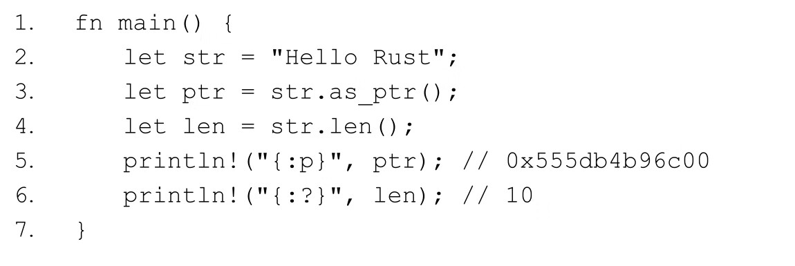 代码清单3-1声明了字符串字面量str,通过as_ptr()和len()方法,可以分别获取该字符串字面量存储的地址和长度信息。这种包含了动态大小类型地址信息和携带了长度信息的指针,叫作胖指针(Fat Pointer),所以&str是一种胖指针。
