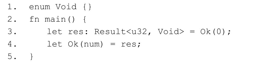 Rust中使用Result类型来进行错误处理,强制开发者处理Ok和Err两种情况,但是有时可能永远没有Err,这时使用enum Void{}就可以避免处理Err的情况。当然这里也可以用if let语句处理,但是这里为了说明空枚举的用法故意这样使用。