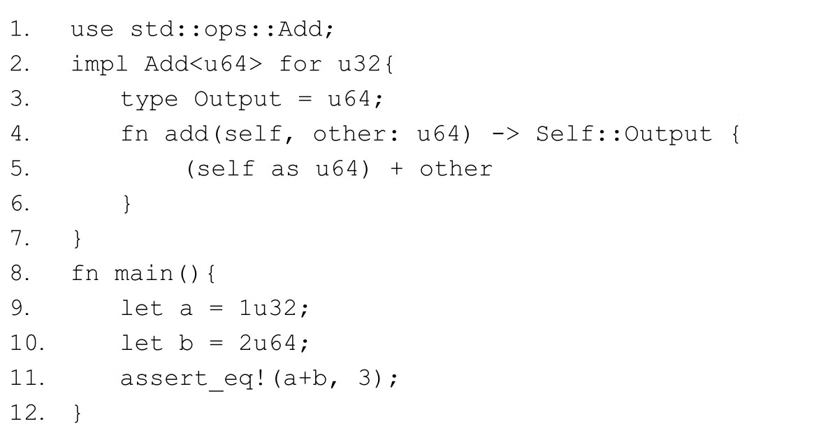 代码第9行到第13行表示为u32类型实现Add,并且要求只能和u32类型相加,但是返回值是i32类型。