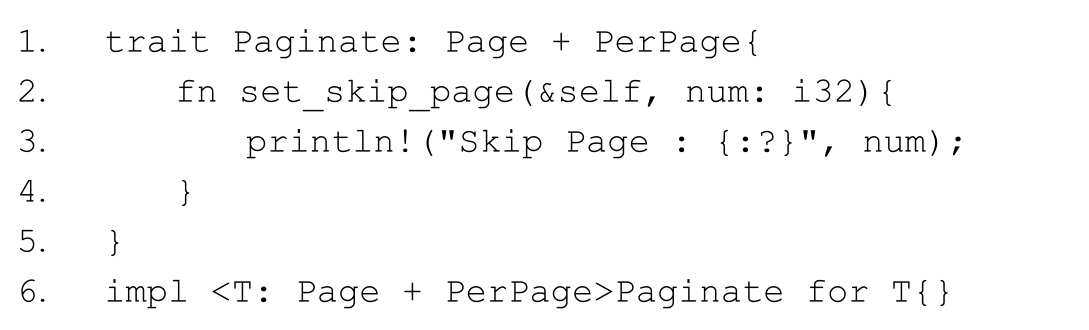 代码第6行为泛型T实现了Paginate,并且包括空的impl块。整行代码的意思是,为所有拥有Page和PerPage行为的类型实现Paginate。