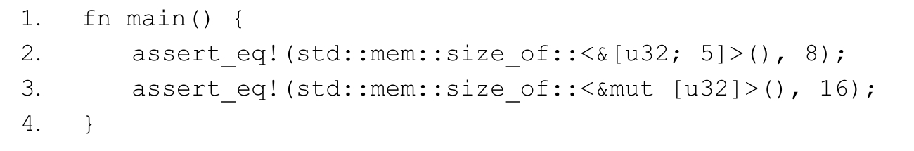 代码清单3-5中的std::mem::size_of<&[u32;5]>()函数可以返回类型的字节数。输出结果分别为8和16。&[u32;5]类型为普通指针,占8个字节;&mut [u32]类型为胖指针,占16个字节。可见,整整多出了一倍的占用空间,这也是称其为胖指针的原因。