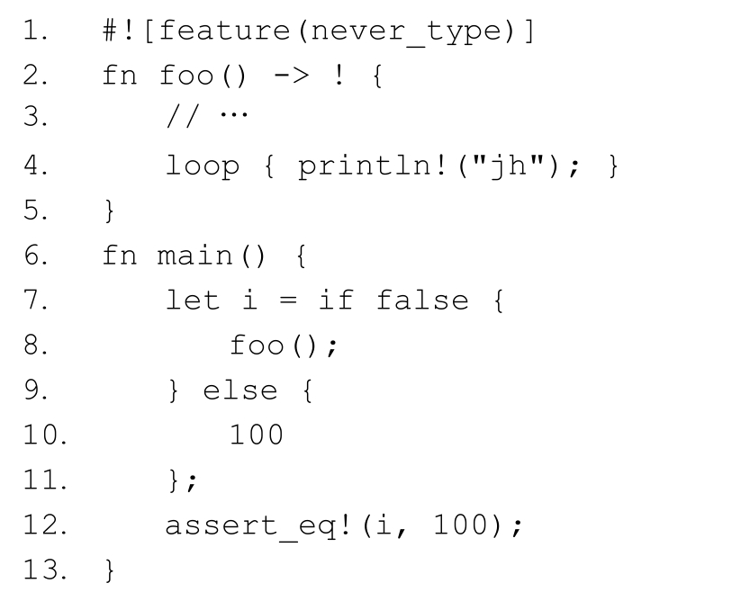 代码清单3-9的if条件表达式中,foo函数返回!,而else表达式返回整数类型,但是编译可以正常通过,假如把else表达式中的整数类型换成字符串或其他类型,编译也可以通过。