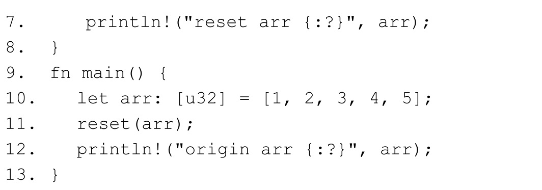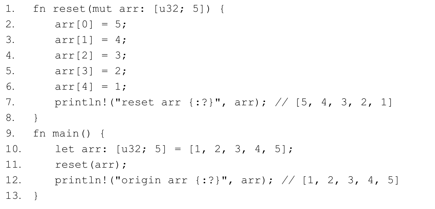 代码清单3-3能够正常编译,从输出结果可以看出来,修改的数组并未影响原来的数组。这是因为u32类型是可复制的类型,实现了Copy trait,所以整个数组也是可复制的。所以当数组被传入函数中时就会被复制一份新的副本。这里值得注意的是,[u32]和[u32;5]是两种不同的类型。
