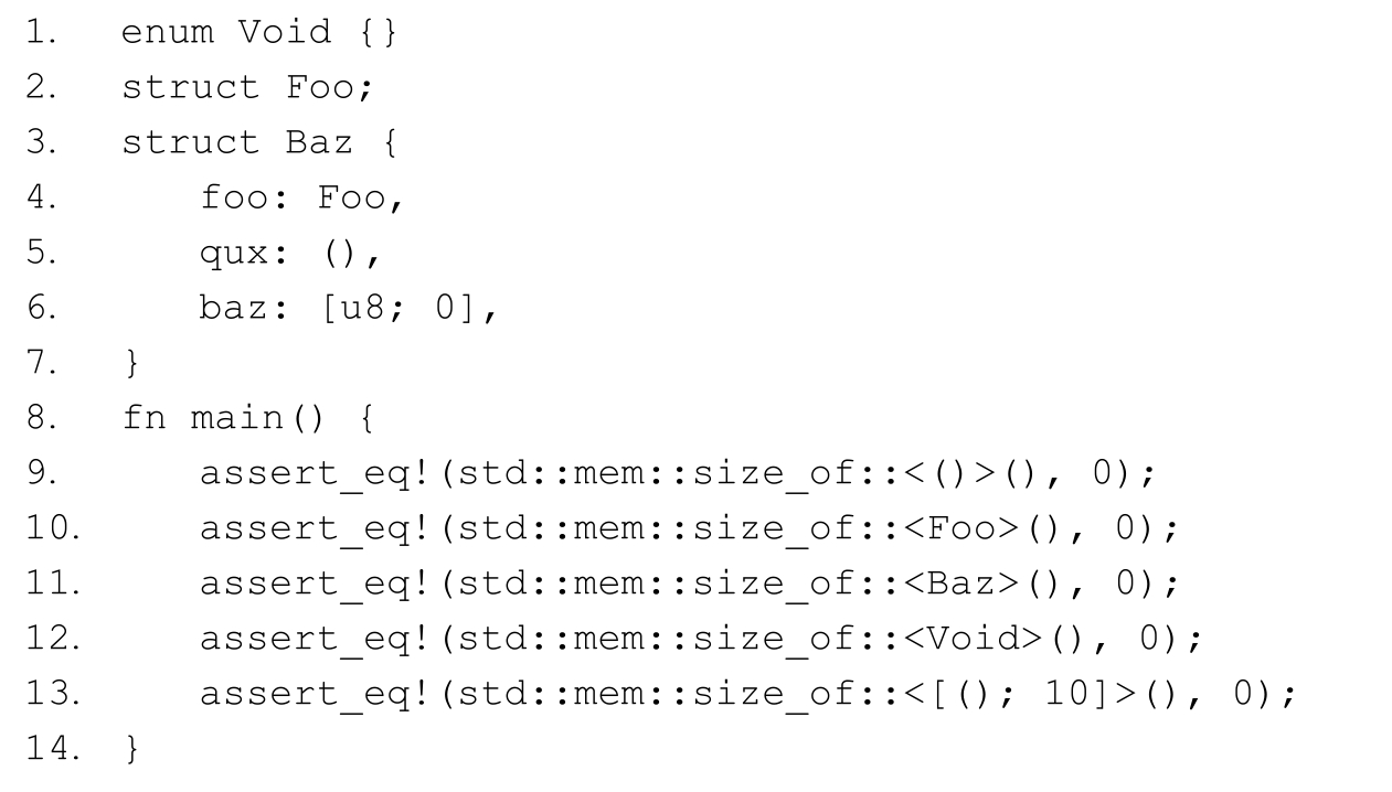 除了可确定大小类型和DST类型,Rust还支持零大小类型(Zero Sized Type,ZST),比如单元类型和单元结构体,大小都是零。代码清单3-6展示了一组零大小的类型。