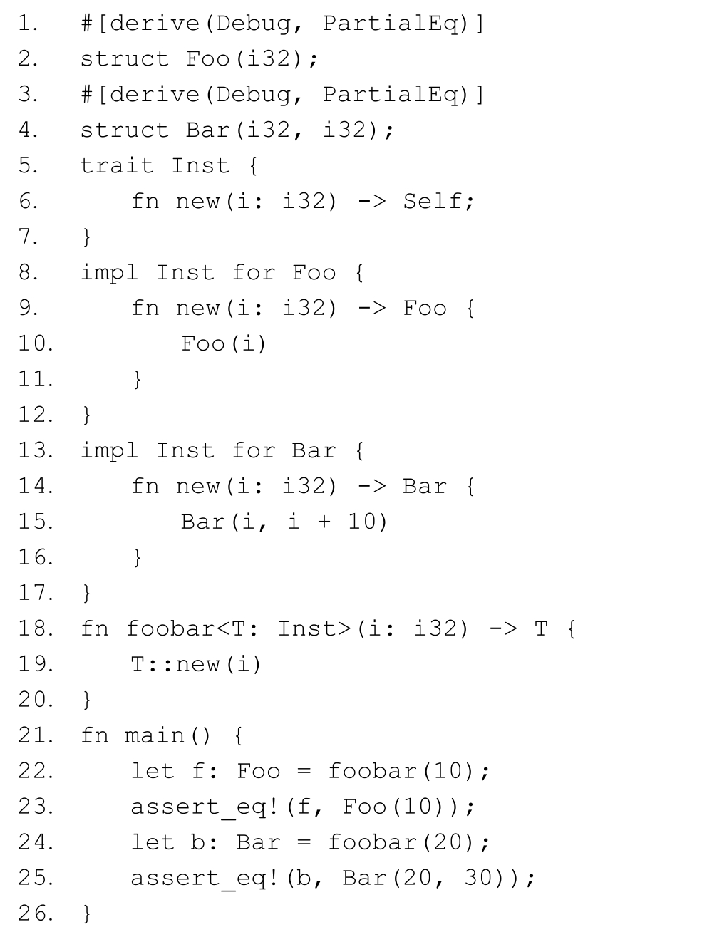代码清单3-21中定义了两个元组结构体Foo和Bar,分别为它们实现了Inst trait中定义的new方法。然后定义了泛型函数foobar,以及函数内调用泛型T的new方法。