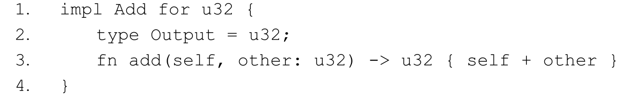 代码清单3-24展示了标准库中为u32类型实现Add trait来定义加法的源码,为了突出重点,这里删减了一些不必要的内容。