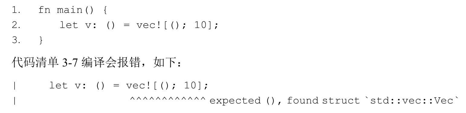编译器会提示:期望的是单元类型,这是因为代码里直接指定了单元类型,但是却发现了std::vec::Vec类型。这样我们就知道了右值vec![();10]是向量类型。