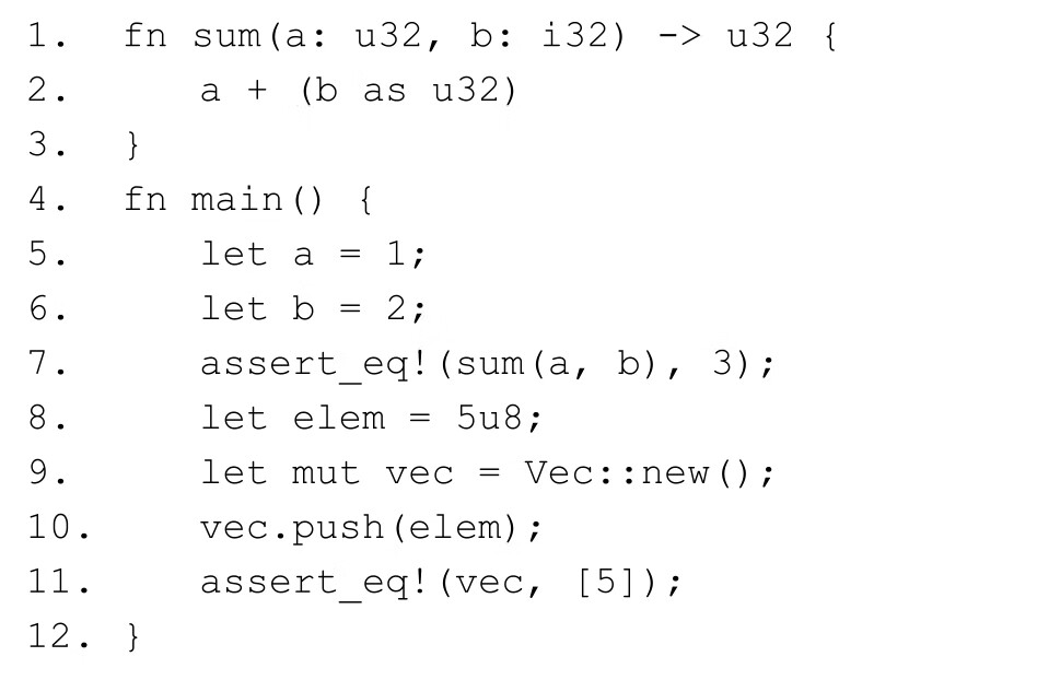 在代码清单3-11中,第5行和第6行声明了两个变量a和b,并没有标注类型。但是传入sum函数中却可以正常运行,这代表Rust自动推导了a和b的类型。代码第8行声明了一个u8类型elem,第9行创建了一个空的向量,类型为Vec<_>,可以通过代码清单3-7的方法来查看此类型。第10行用push方法将elem插入vec中,此时vec的类型为Vec<u8>。