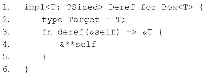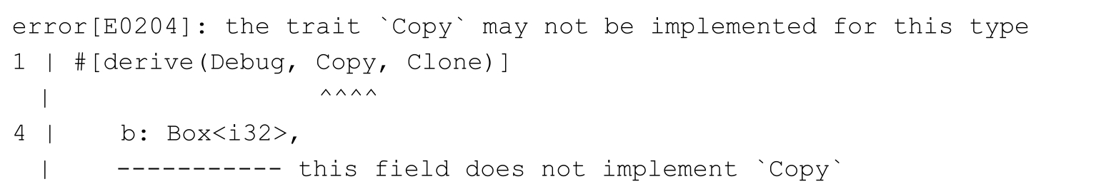 智能指针Box<T>封装了原生指针,是典型的引用类型。Box<T>无法实现Copy,意味着它被Rust标记为了引用语义,禁止实现按位复制,如代码清单5-4所示。