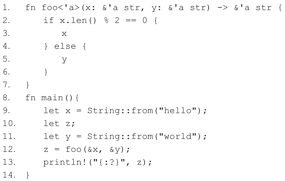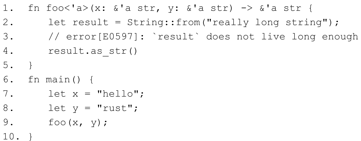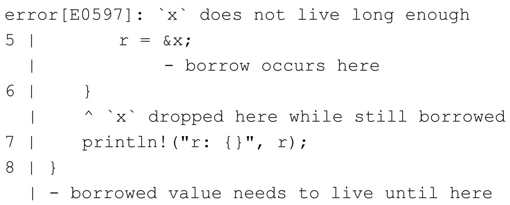 代码清单5-60编译会出错,提示代码第12行中&y借用存活时间不够长。但是修复这个错误很简单,只需要将第10行和第11行代码互换位置即可。