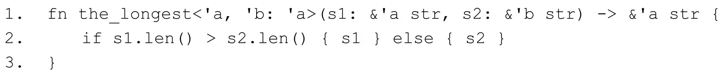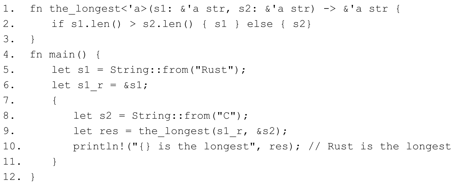 编译器的借用检查机制无法对跨函数的借用进行检查,因为当前借用的有效性依赖于词法作用域,对于编译器来说,这项工作将变得很复杂。所以,需要开发者显式地对借用的生命周期参数进行标注。生命周期参数标注的唯一原则就是约束输出(借用方)的生命周期必须不能长于输入(出借方)的生命周期。Rust内部也硬编码了一些模式来实现自动补齐生命周期参数,这些模式被称为生命周期省略规则,但是生命周期省略规则不同于类型推断,适用的情况比较有限,在无法推断生命周期的情况下,编译器会报错,此时就必须显式地添加生命周期参数。当然,Rust官方团队正在努力改进生命周期省略规则,以减少需要显式地标注生命周期参数的情况,也在通过引入非词法作用域生命周期(Non Lexical Lifetime)来改进函数本地对借用的生命周期推断。