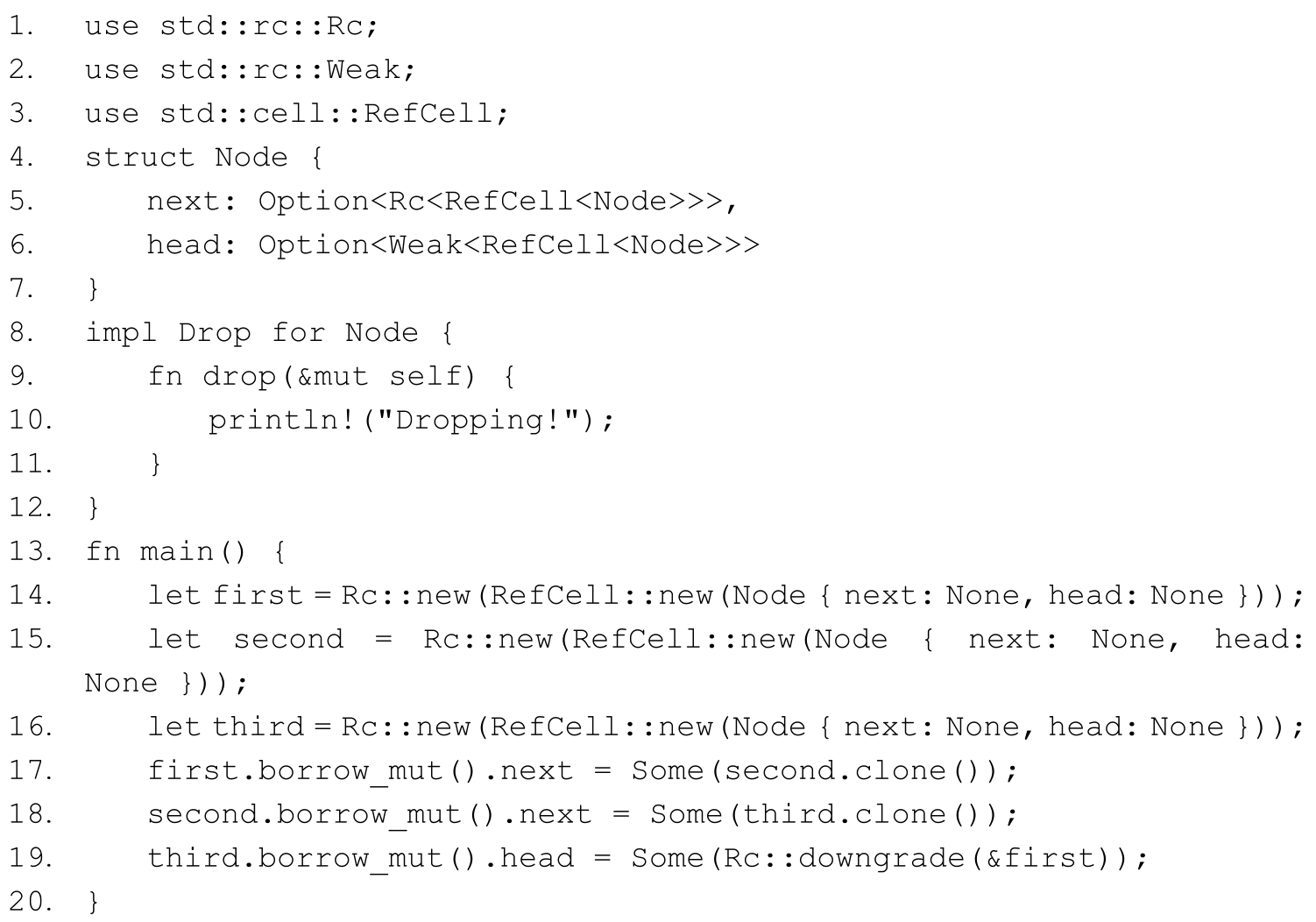 除了普通的引用,Rust还引入了智能指针来帮助开发者处理一些场景。比如引用计数智能指针Rc<T>可以共享所有权,方便在需要多个变量读取资源但不想转移或借用所有权的情况下使用。同时,Rust也提供了Rc<T>的弱引用版本Weak<T>,来帮助消除循环引用情况下引起的内存泄漏。除此之外,Rust还提供了内部可变容器Cell<T>和RefCell<T>,使用内部可变容器可以对不可变的结构体字段进行修改,以满足某些需求。Rust也提供了来自写时复制思想的Cow<T>容器,以帮助开发者减少复制,提升性能,并统一实现规范。