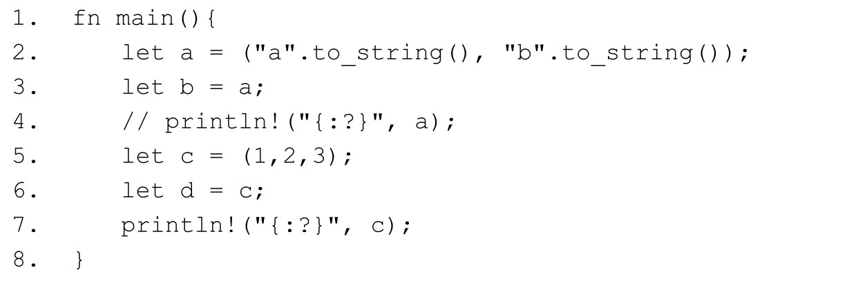 枚举体和结构体是类似的,当成员均为复制语义类型时,不会自动实现Copy。而对于元组类型来说,其本身实现了Copy,如果元素均为复制语义类型,则默认是按位复制的,否则会执行移动语义,如代码清单5-8所示。