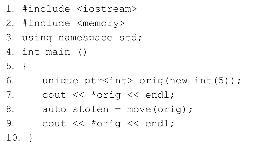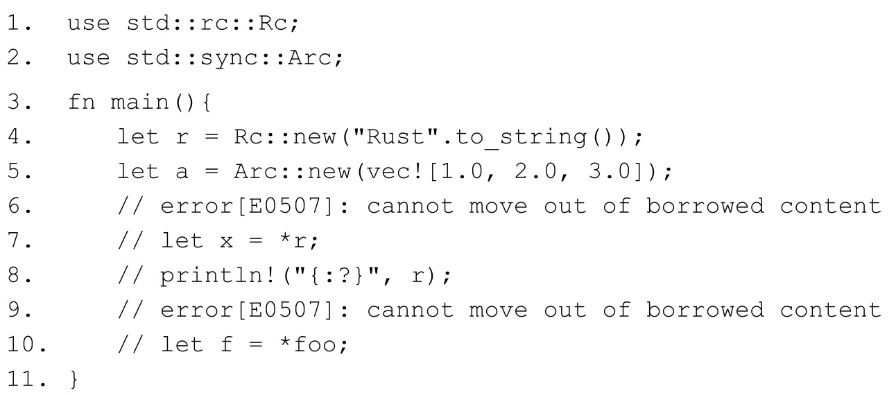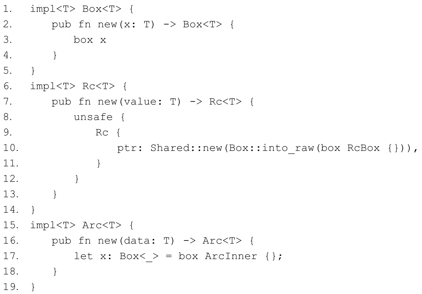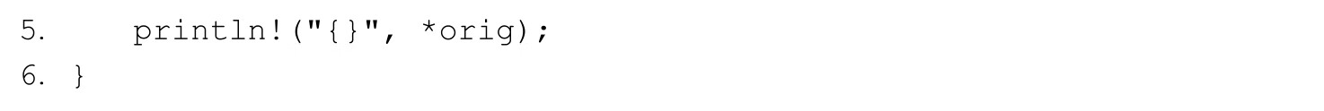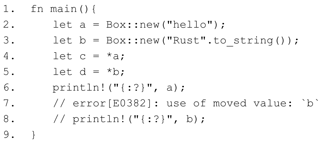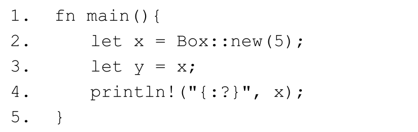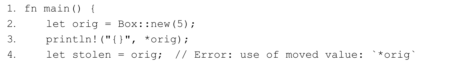 代码清单5-1中的unique_ptr指针等价于Rust中的Box<T>智能指针。代码清单5-1和5-2,均是利用智能指针在堆上分配了内存,变量orig对此堆内存持有所有权(唯一控制权),然后将orig重新赋予变量stolen。