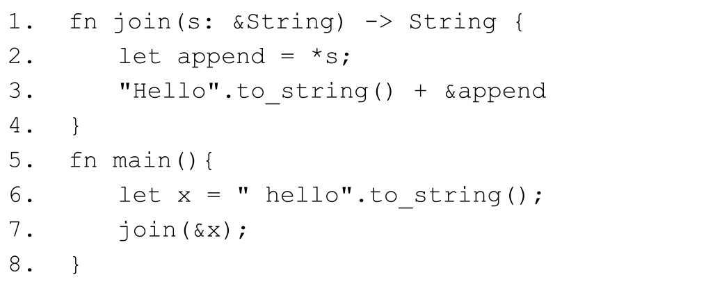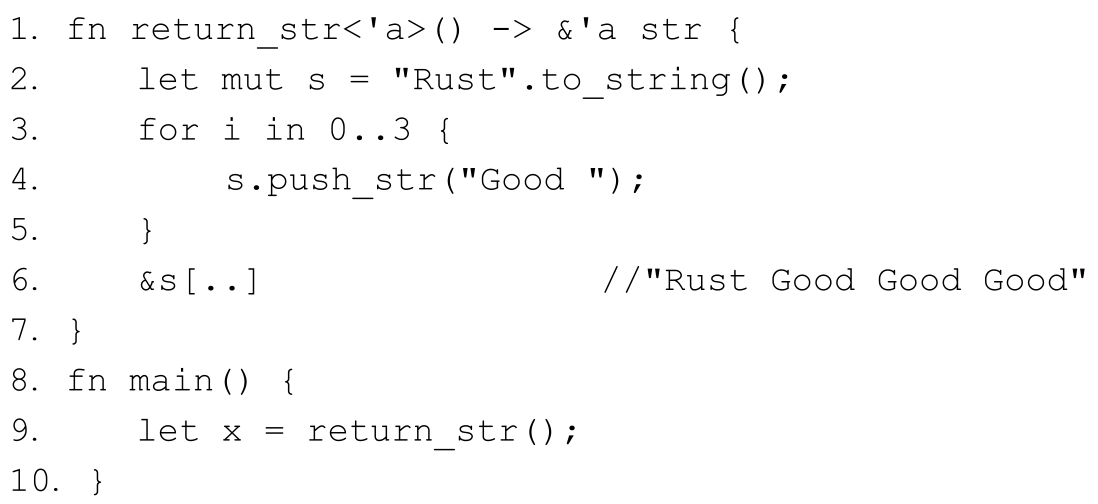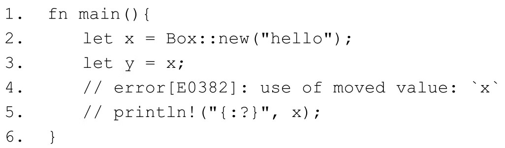 在代码清单5-1(C++代码)中,使用了move函数,将原来的unique_ptr指针赋予了stolen,并转让了所有权。原来的orig 则变为了空指针,而对空指针解引用是很不安全的,所以该C++代码运行时就会抛出段错误segmentation fault)。但对于开发者来说,最想要的是一个编译期的保证,因为调试运行时错误比较困难,如果能在编译时发现隐藏的内存安全问题,就会方便很多,对于代码调试和稳定运行均有好处。