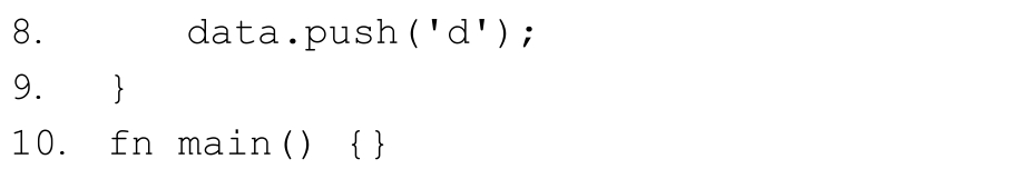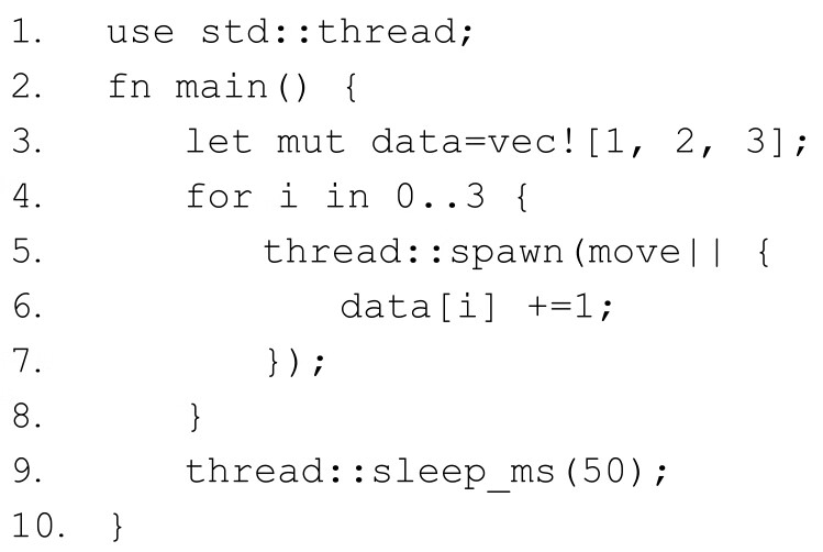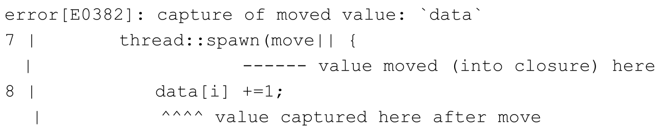 错误显示,data所有权已经被转移了,但是编译器发现它还在被使用,所以报错。代码清单5-59是线程不安全的代码,在多线程情况下修改data的元素会引起数据竞争。
