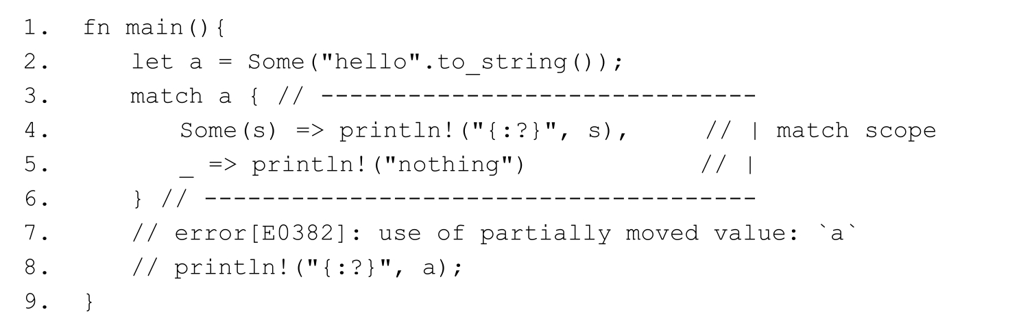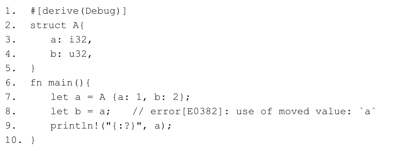 代码清单5-6的第8行编译会报错,说明在进行赋值操作时,a的所有权发生了转移。在后面的println!语句中,a就无法再次使用。