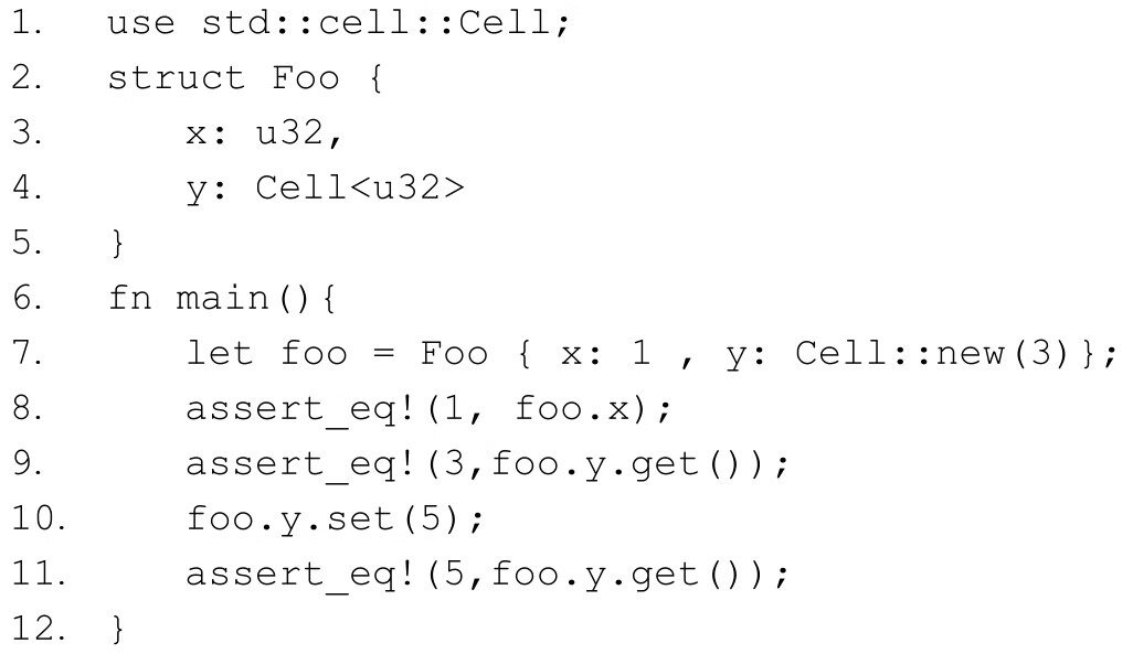 代码清单5-53中定义了结构体Foo,其中字段x是u32类型,y是Cell<u32>类型,main函数中创建了该结构体的实例 foo,默认是不可变的。第9行代码通过get()方法来取得Cell<u32>容器中的值,第10行代码通过set()方法来重新设置y的值。整个代码编译成功。