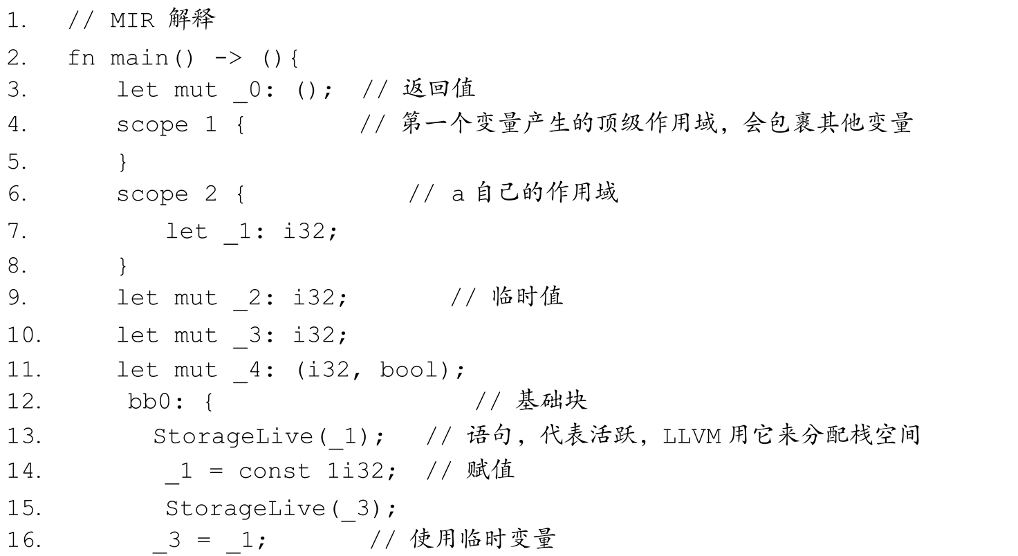 代码清单5-62是代码清单5-61生成的MIR代码,请注意查看上面配套的注释。整体来说,该段代码分成两个基本块,从bb0流向bb1。其中StorageLive和StorageDead语句表示变量的活跃信息,该活跃信息将会发给LLVM,LLVM会根据此信息将变量分配到不同的栈槽(Stack Slot)。只有活跃的变量才可以使用。读者可以自行尝试使用更加复杂的代码生成MIR,在其中还会发现drop等语句,其实就是由编译器自动插入的drop flag。