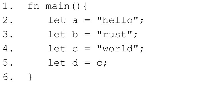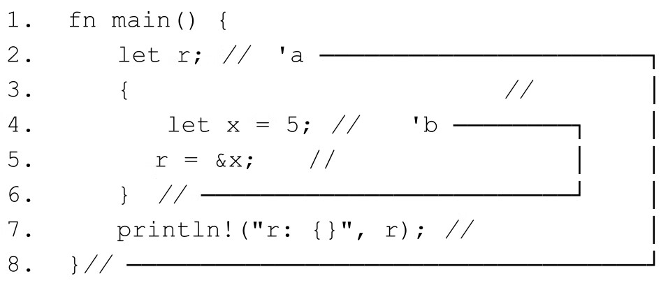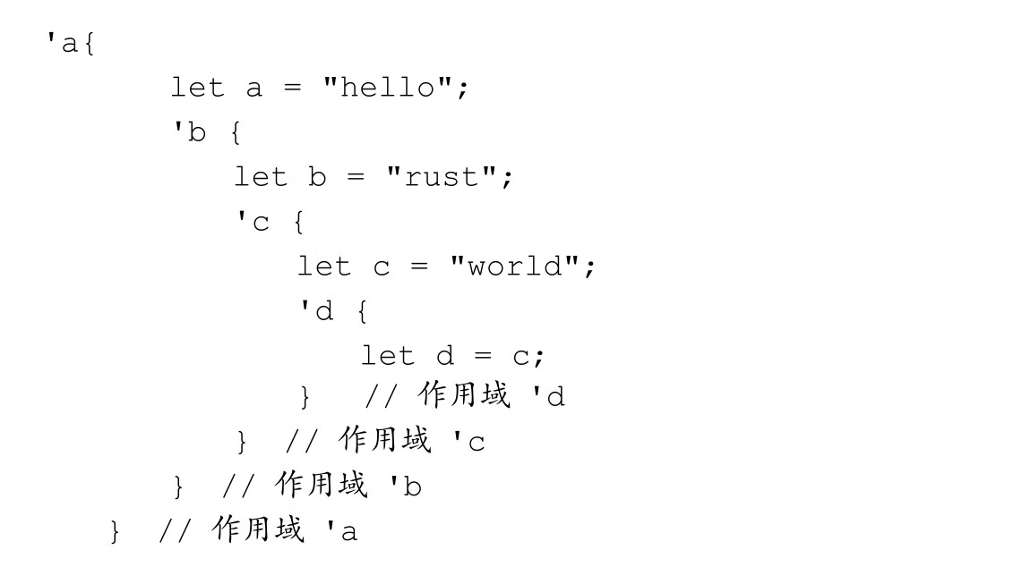 看得出来,绑定a的作用域包含着'b、'c、'd的作用域,以此类推,最后声明的绑定的作用域在最里面。