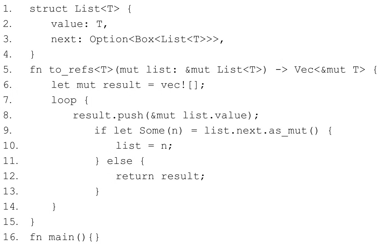 在代码清单5-64中,在一个loop循环中使用了可变借用&mut list.value,当前的借用检查器会认为这个可变借用是多次借用,从而编译报错。在使用Rust 2018版本时,该代码能够正常编译通过。也就是说NLL也解决了无限循环中借用检查的问题。