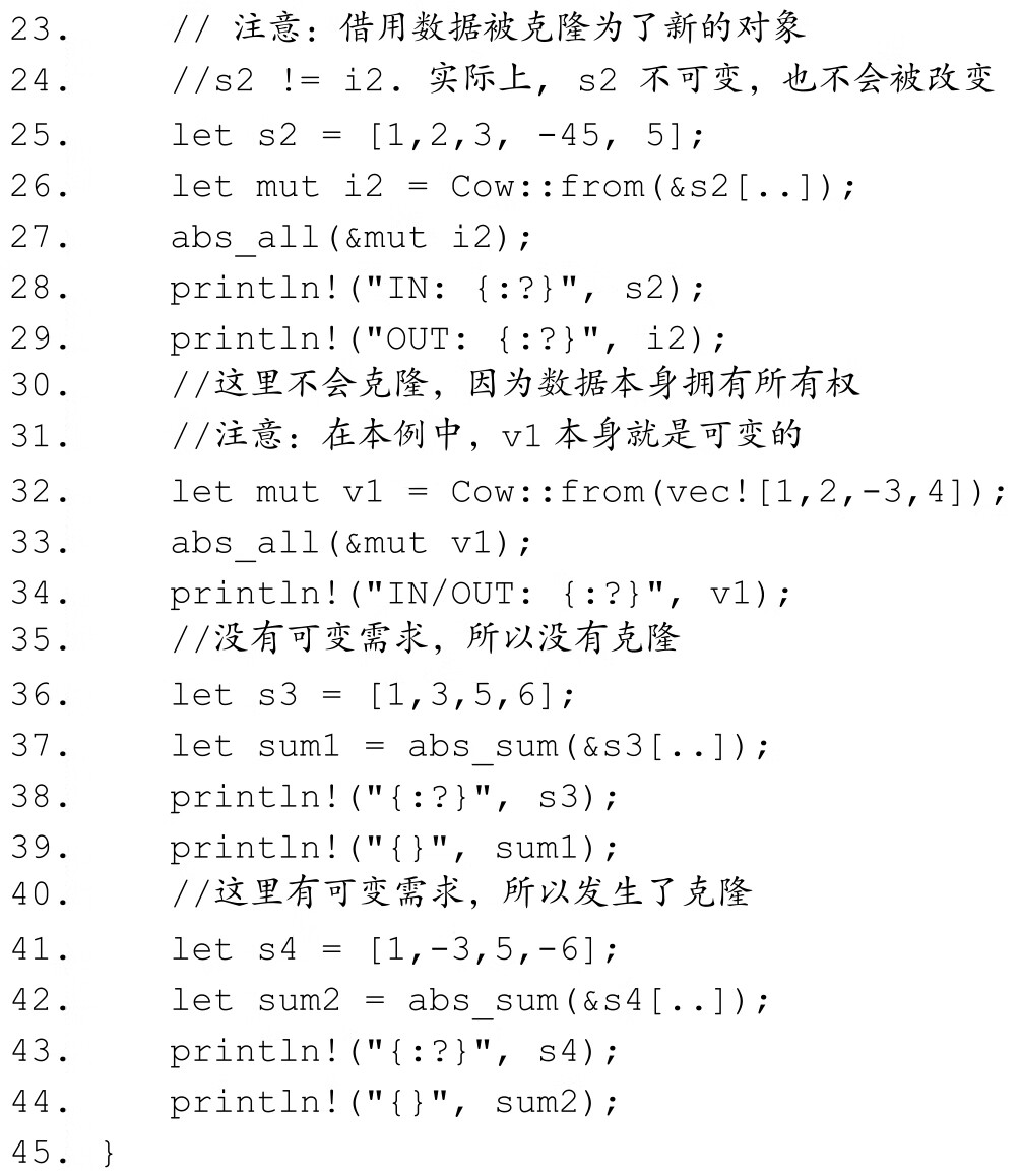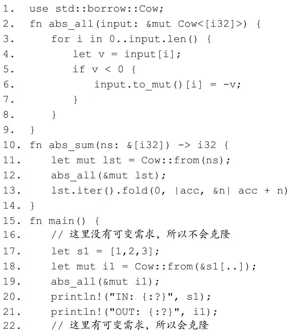 代码第17行到第21行声明了两个绑定s1和i1,其中i1是通过Cow::from方法来创建的。并且将&mut i1作为参数传给abs_all函数,因为s1中元素都大于0,所以并不进入该函数中的if表达式里,也就不会调用to_mut方法,所以,并不会发生克隆。所以第20行和第21行的输出为如下。