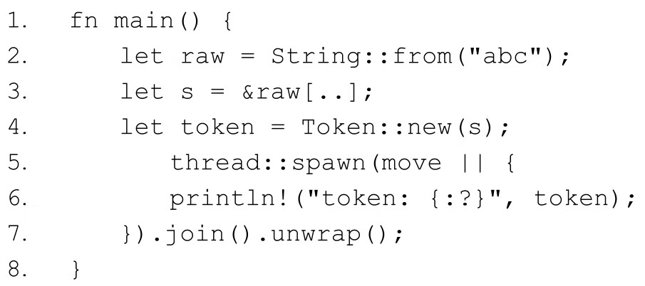但是如果创建 token的时候使用动态字符串切片,则会因为生命周期的问题而无法跨线程安全传递,比如将main函数修改为代码清单5-58所示的情况。