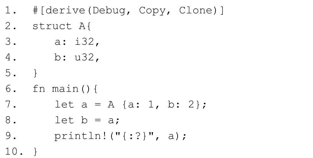 可见,虽然结构体A的成员都是复制语义类型,但是Rust并不会默认为其实现Copy,如果想解决这个问题,可以手动为结构体A实现Copy,如代码清单5-7所示。