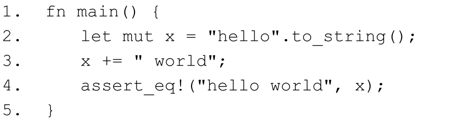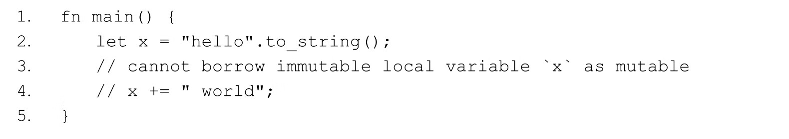 在代码清单5-10中,第4行代码中的+=操作相当于x=x+"world",这样的操作在传统的变量默认可变的语言中很常见。但是在Rust中,编译器会报出第3行注释所示的错误。绑定x默认为不可变,所以编译器不允许修改一个不可变的绑定。