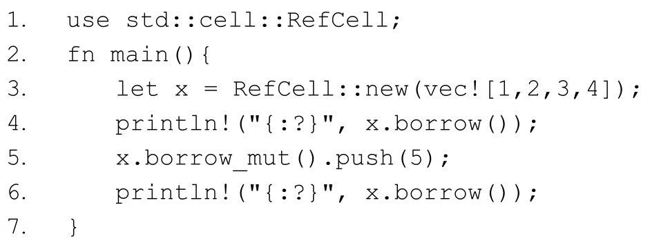 对于没有实现Copy的类型,使用Cell<T>有许多不便。Rust 提供的RefCell<T>适用的范围更广,对类型T并没有Copy的限制,代码清单5-54展示了其内部可变性。