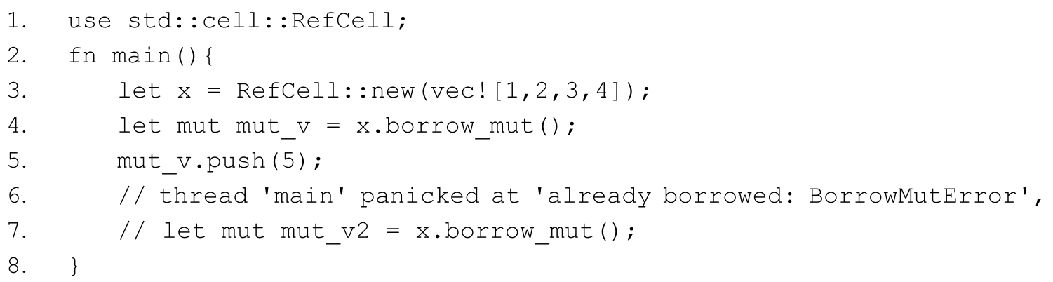 代码清单5-55的第7行通过borrow_mut方法第二次获取可变借用,这显然违反了借用规则,虽然是运行时检查,但其借用规则和Rust编译器借用检查规则是一样的,所以此时main函数线程就会崩溃,并抛出第6行注释所示的错误内容。
