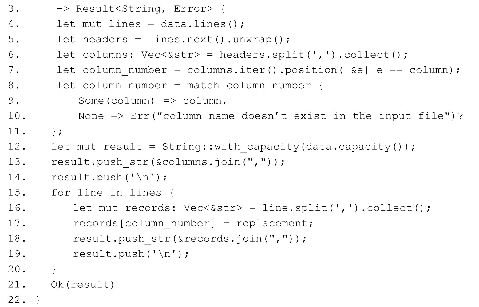 代码第12~20行,创建了一个可变的新字符串result,将头部数组columns使用join方法转换为用逗号分隔的字符串,加上换行符。然后将剩余的lines 按行迭代,每一行先转换为Vec<&str>可变数组records,再通过column_number将指定位置的值替换为新值replacement。最后将替换好的records通过join方法转换为用逗号分隔的字符串,加上换行符。