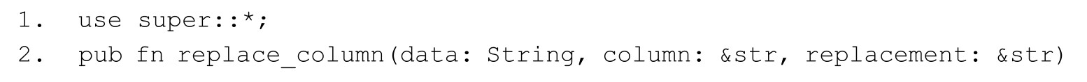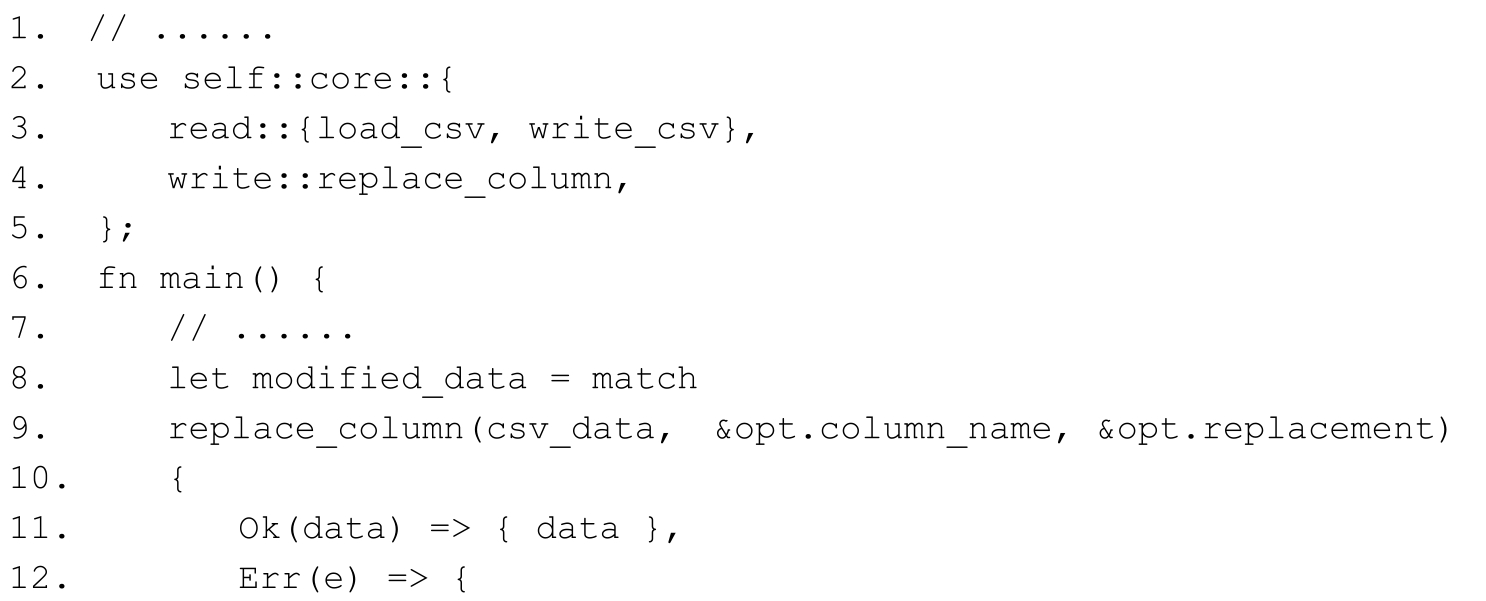 代码第2行定义的pub函数replace_column接收三个参数:读取到的原始CSV字符串data、指定的字段column和要匹配的新值replacement。