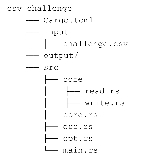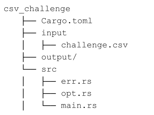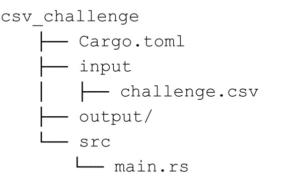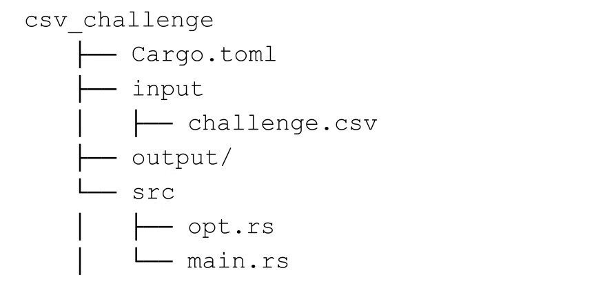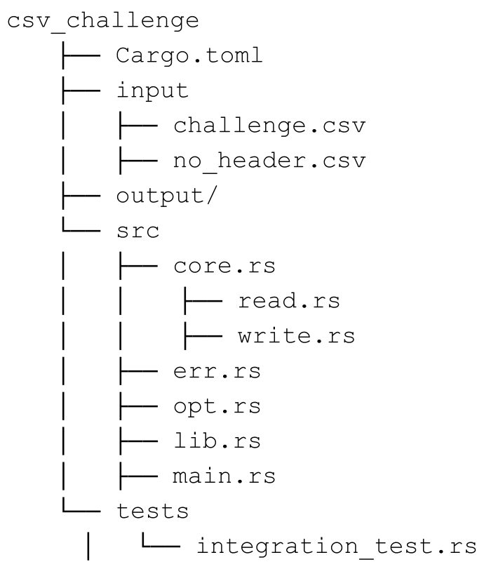 如果使用cargo build命令编译正常,就可以增加集成测试了。在csv_challenge包的根目录下创建tests文件夹,在其中创建integration_test.rs文件。同时,在input目录下创建一个非法的CSV文件no_header.csv,将去掉头部的CSV内容复制到其中,用于测试异常情况。