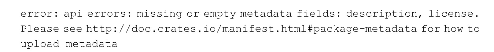 则说明该包 Cargo.toml文件的[package]表中还缺失必要的元信息,比如description、license等。可以到错误信息提示的网址中查找更详细的内容。这些必要信息添加以后,就可以正常发布了。这样,其他开发者就可以通过cargo install命令来安装并使用此包了。