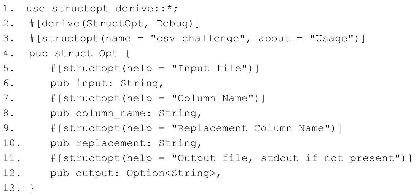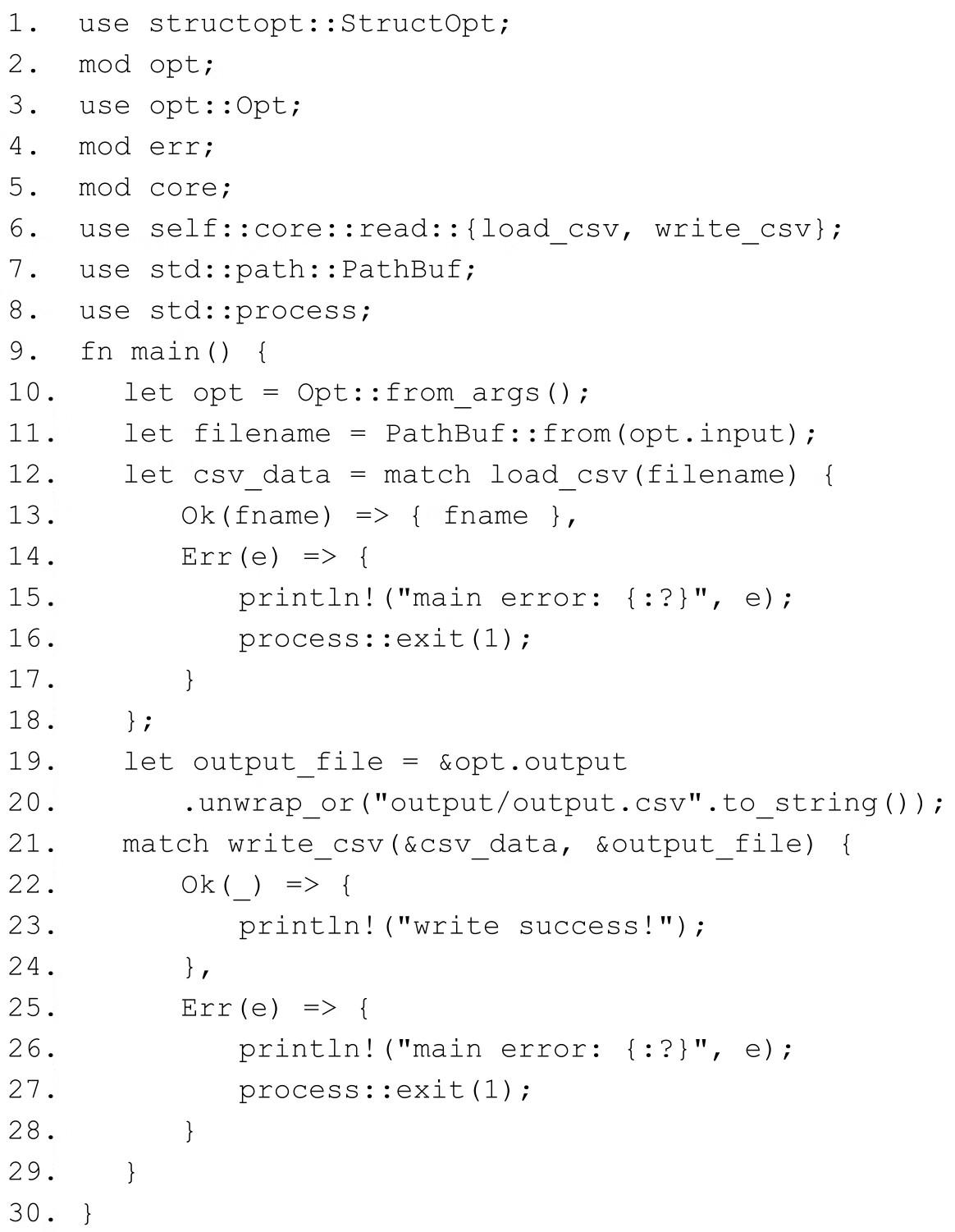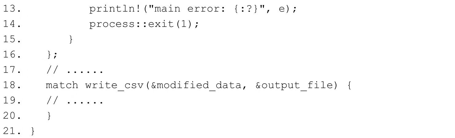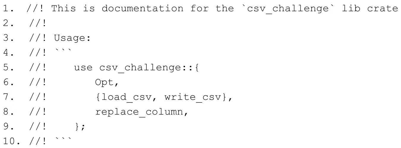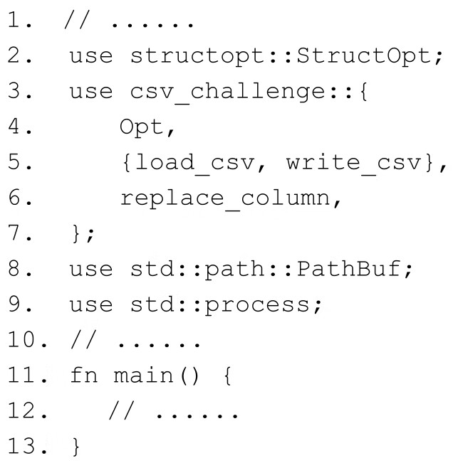 代码清单10-59展示了main.rs文件中需要修改的部分。代码第3行,通过引入库包csv_challenge来使用其中暴露的函数。