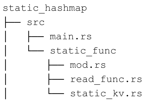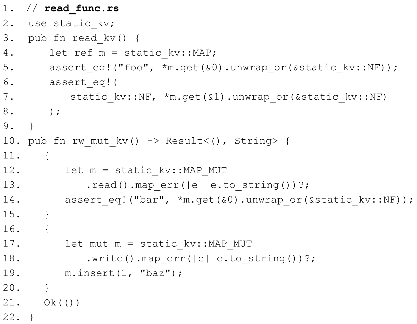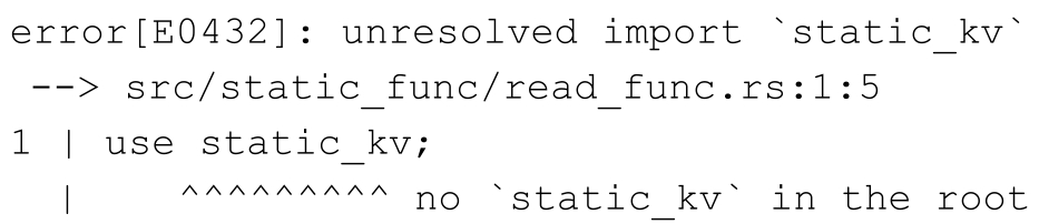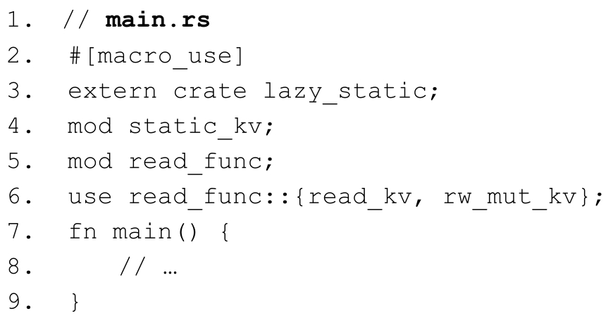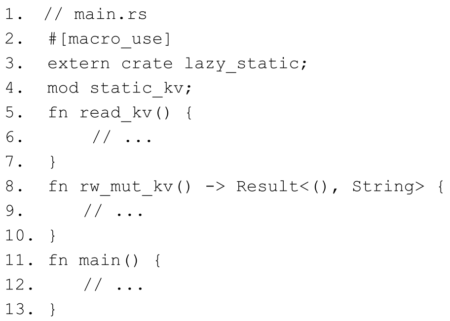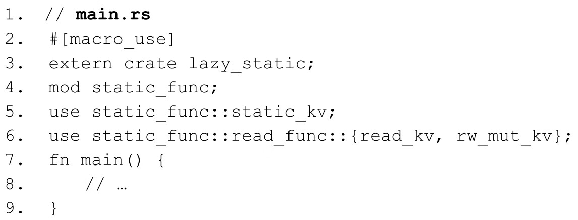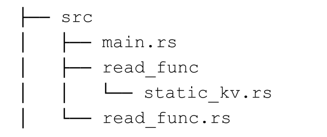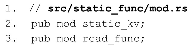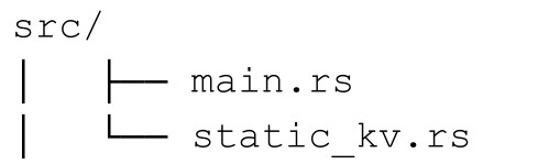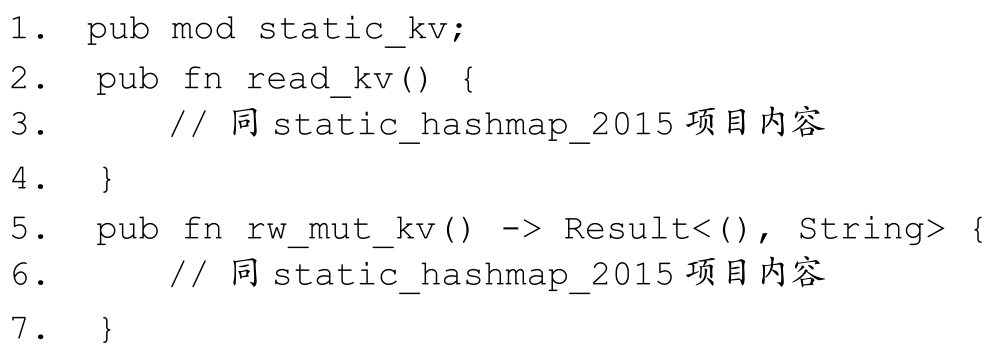 代码第2~19行,使用mod关键字定义了static_kv模块。模块是Rust模块化编程的基础,其作用域是独立的、封闭的,在static_kv中定义的常量或方法默认是私有的。所以,想要在模块外调用模块中的常量或方法,就必须通过pub关键字将可见性改为公开的。