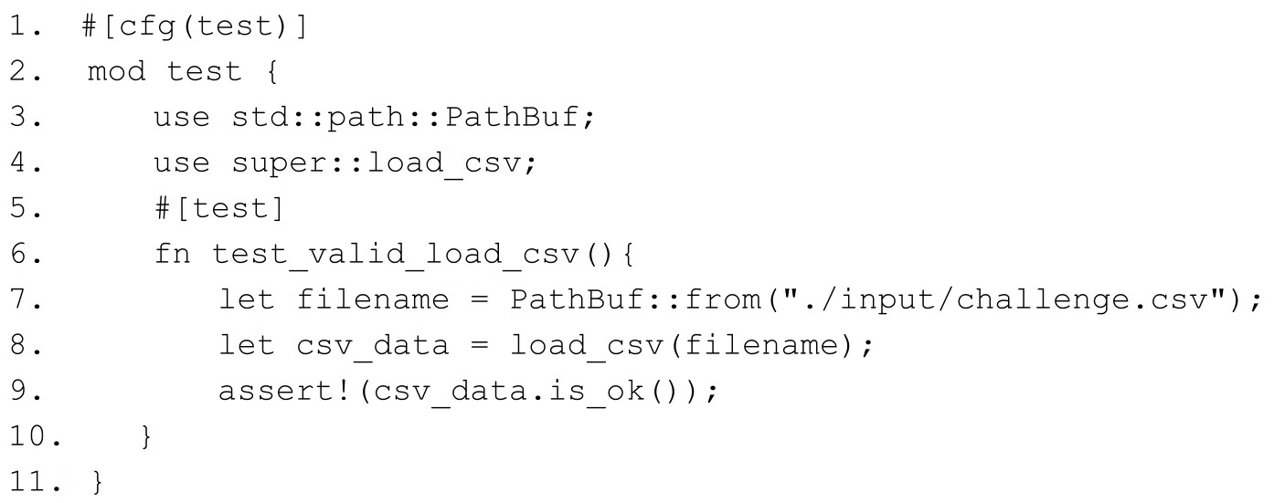 Rust允许在文件中使用mod test为相关功能提供单元测试。现在为load_csv函数增加单元测试,如代码清单10-57所示。