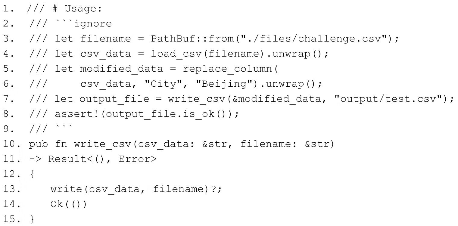 比如代码第2行,如果将ignore去掉,则在执行cargo test命令时注释中的代码会被当成 Rust 代码执行;如果去掉“```”语法,则生成代码时无法高亮显示。因为在前面已经为write_csv 增加了单元测试,这里就没必要再进行测试了,所以使用“```ignore”可以在编译时忽略这段代码的文档测试属性,只用来生成文档。