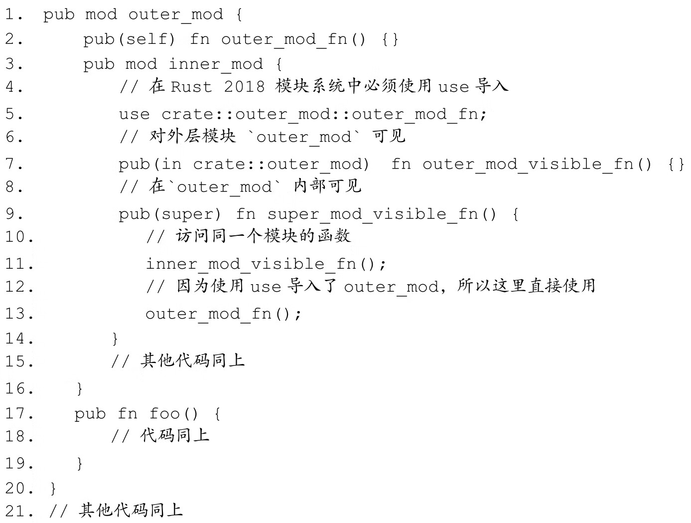 代码第13行,在super_mod_visible_fn函数中调用outer_mod中定义的outer_mod_fn函数,需要使用“::”前缀,代表从根模块开始寻找相应的模块路径。所以,“::outer_mod”就表示从顶级模块开始查找outer_mod模块,然后在此模块中查找outer_mod_fn函数。这种路径写法在Rust中叫作统一路径(Uniform Path)。