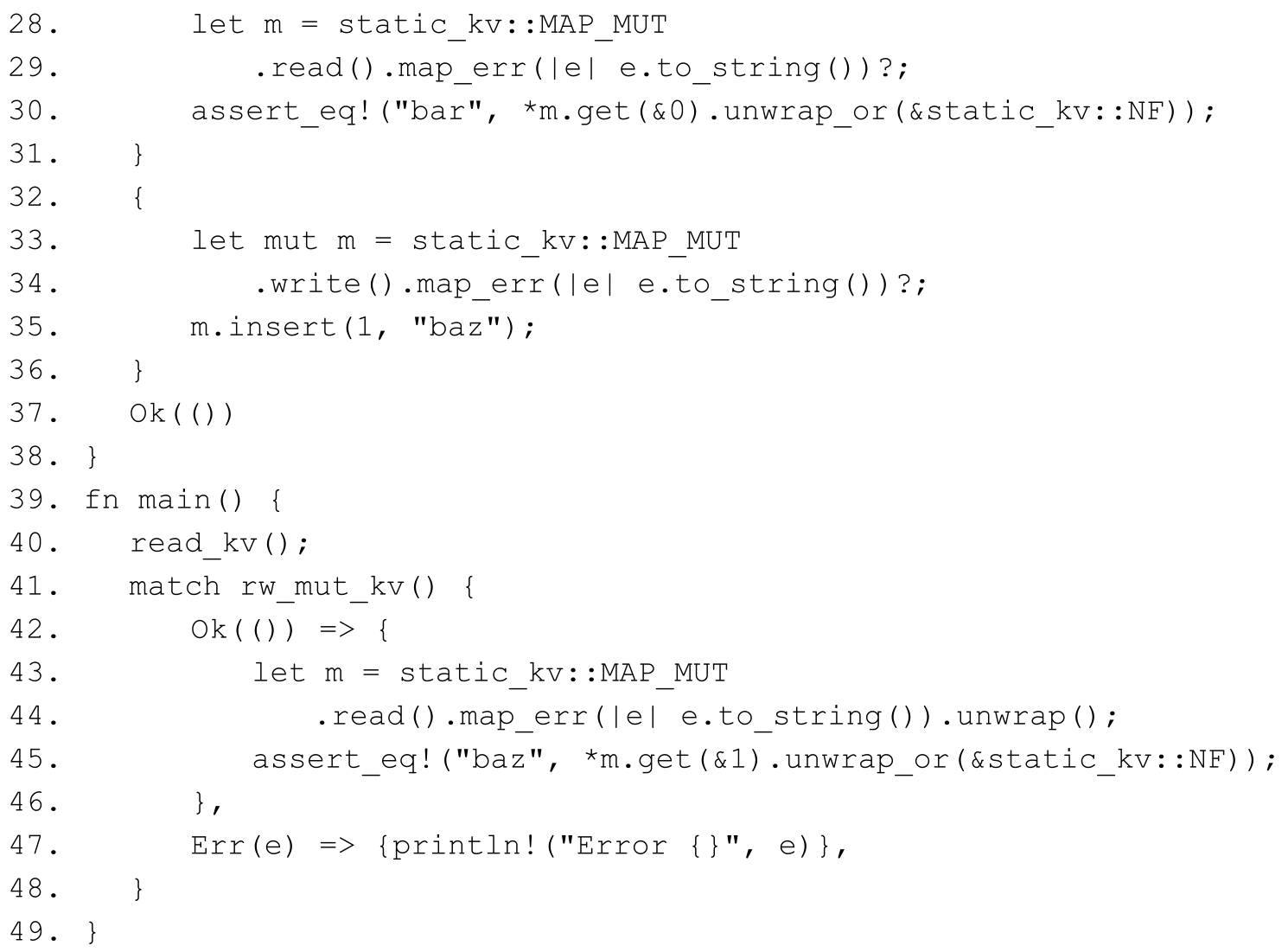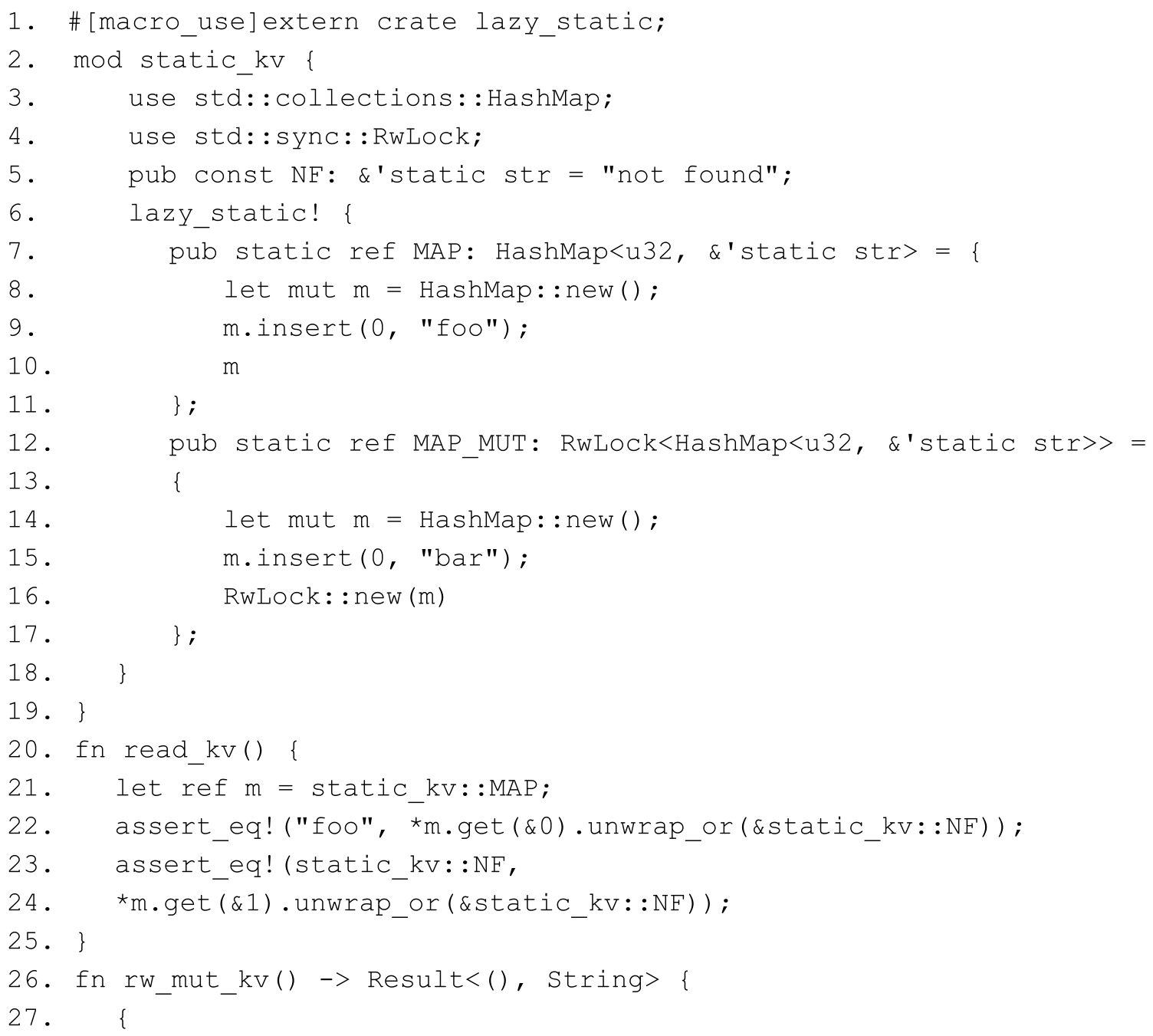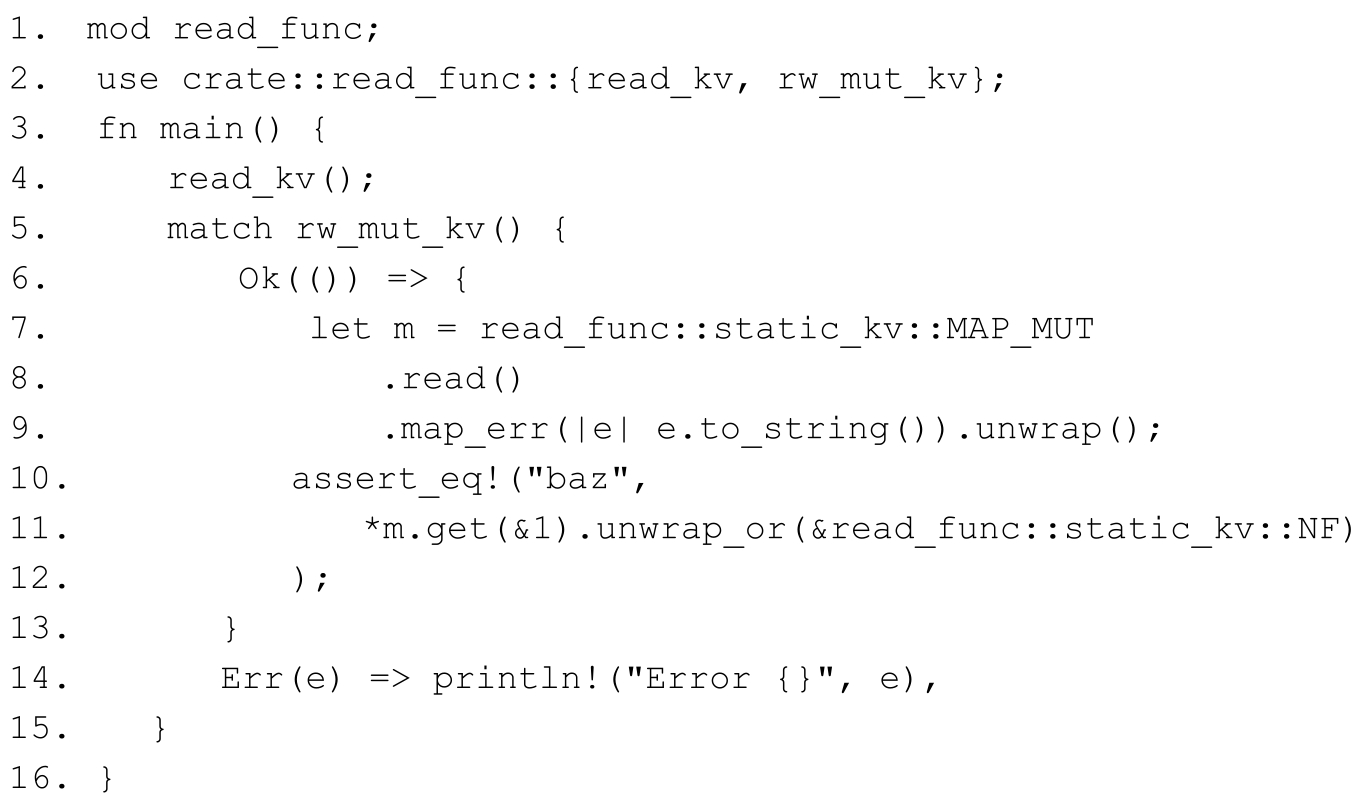 代码第21行,使用了ref 模式匹配来获取 static_kv::MAP的引用m,也可以直接使用&static_kv::MAP来获取引用m。代码第22~24行,通过对m解引用,得到其内部的HashMap类型,并使用get方法来获取存储于MAP中的初始键值对。这里使用get方法来获取HashMap指定键的值,是一个很好的工程实践,因为get方法会返回Option<T>类型。如果没有获取到,则会返回None,或者是指定的其他值,比如该行中的&static_kv::NF,这样更有利于错误处理。也可以直接使用*m[&0]这样的写法,但它返回的是&T 类型,如果没有匹配的值,则线程会发生恐慌。