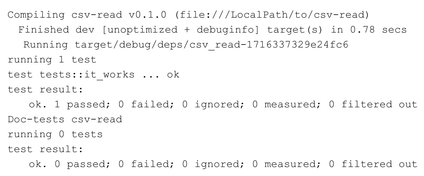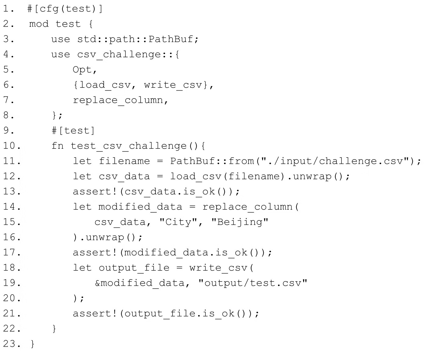 执行cargo test会看到正常的测试输出。限于篇幅,这里只为load_csv增加测试函数,同理,还可以为write_csv和replace_column方法增加单元测试。可以在随书源码中查看csv_challenge包的完整源码及测试代码。