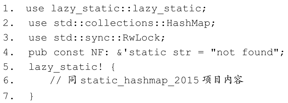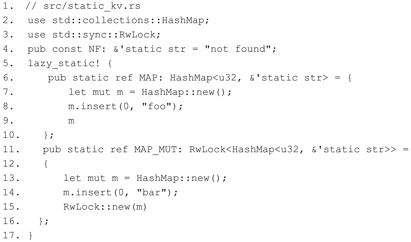 代码第6~18行,使用lazy_static!宏定义了两个全局静态变量MAP和MAP_MUT,分别代表只读的HashMap和可变的HashMap。lazy_static!宏的语法格式如代码清单10-12所示。